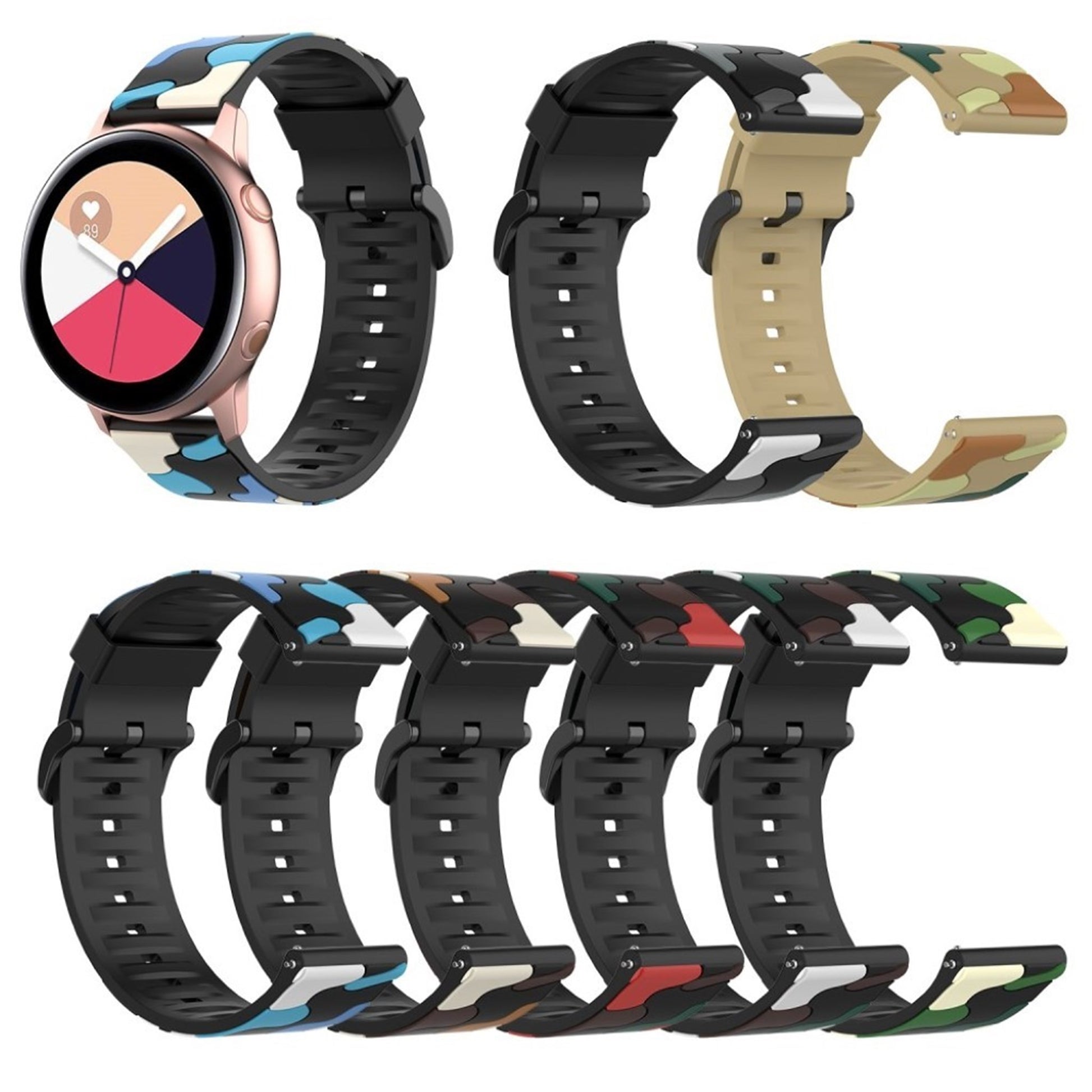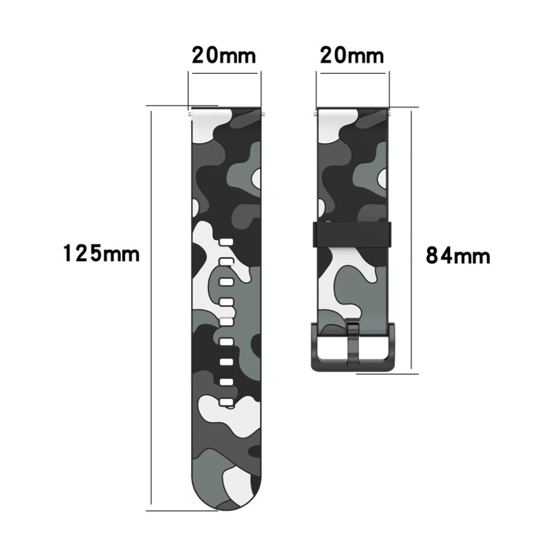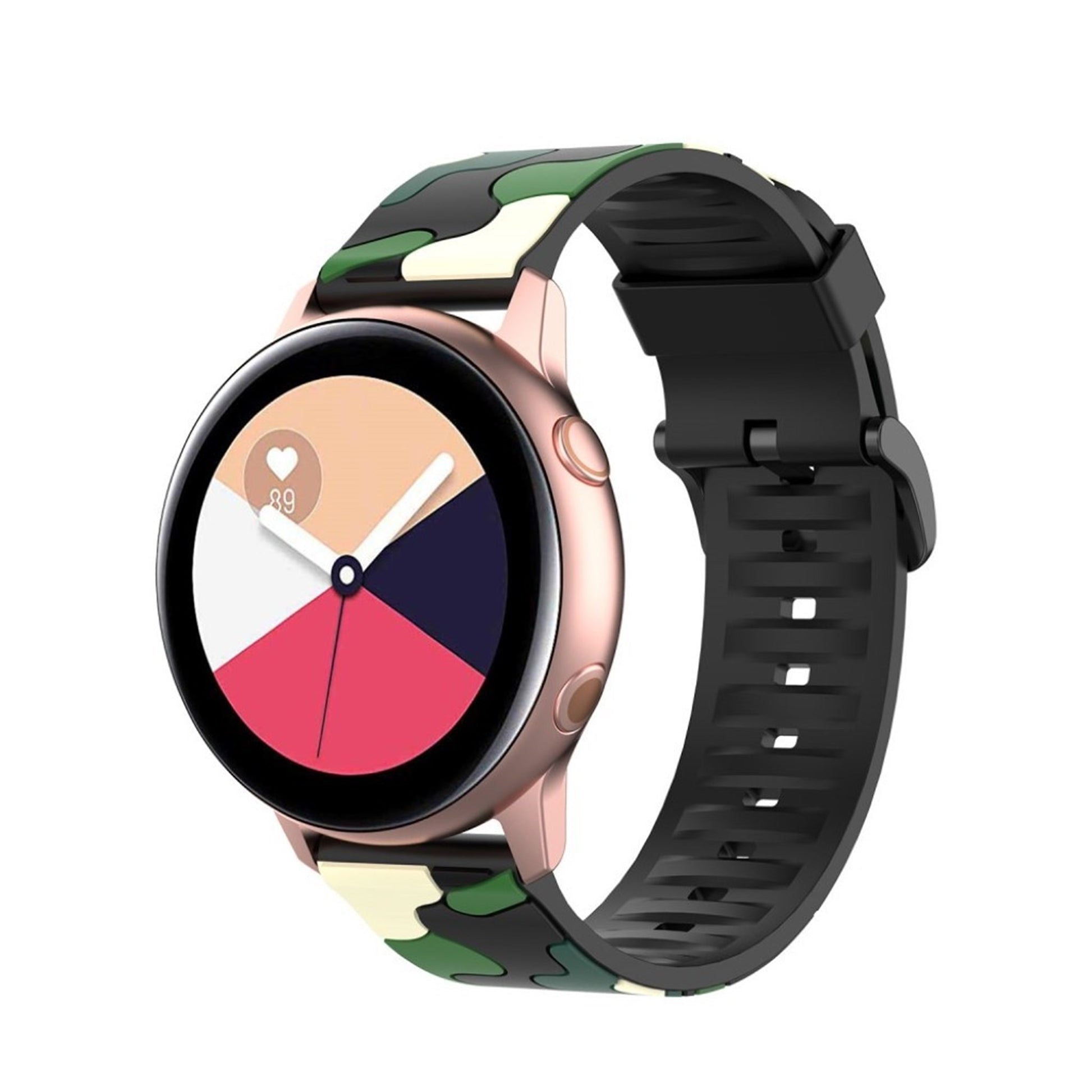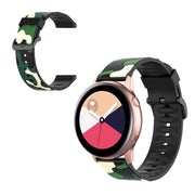 Scopri un bracciale in silicone ecologico dal design militare, perfetto per arricchire il tuo smartwatch. Realizzato con materiali di alta qualità, questo cinturino è progettato per adattarsi ai modelli Samsung Galaxy Active 2, Active R500, Watch 42mm e Gear S2 Classic. La sua particolare finitura in metallo placcato conferisce un tocco di eleganza, mentre il motivo camouflage offre un look distintivo e moderno, ideale per gli amanti dello stile avventuroso.Grazie alla sua struttura versatile, il cinturino presenta un design con molteplici fori, permettendo un'agevole regolazione della lunghezza per adattarsi comodamente a qualsiasi polso. Con una larghezza di 20 mm e una lunghezza totale di 125 + 84 mm, rappresenta la sostituzione perfetta per il tuo vecchio cinturino, aumentando la longevità e il comfort del tuo dispositivo. Aggiorna il tuo accessorio con un tocco di stile e funzionalità, senza compromettere l'ecosistema. Perfetto per ogni occasione, questo cinturino ti accompagnerà in ogni tua avventura quotidiana.