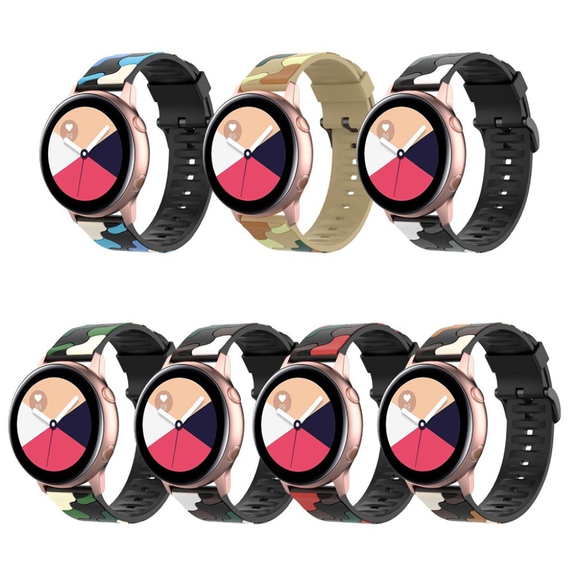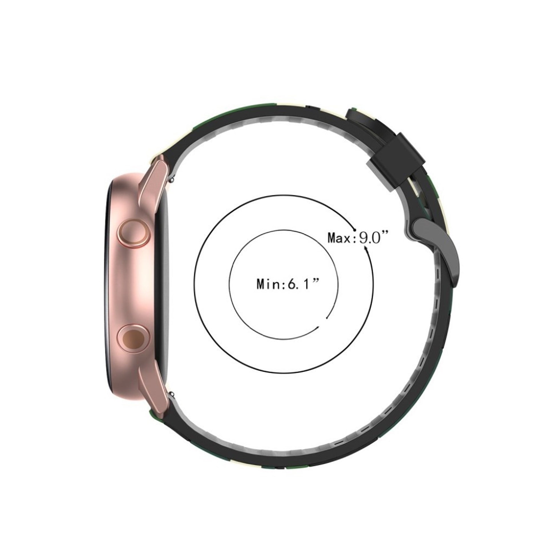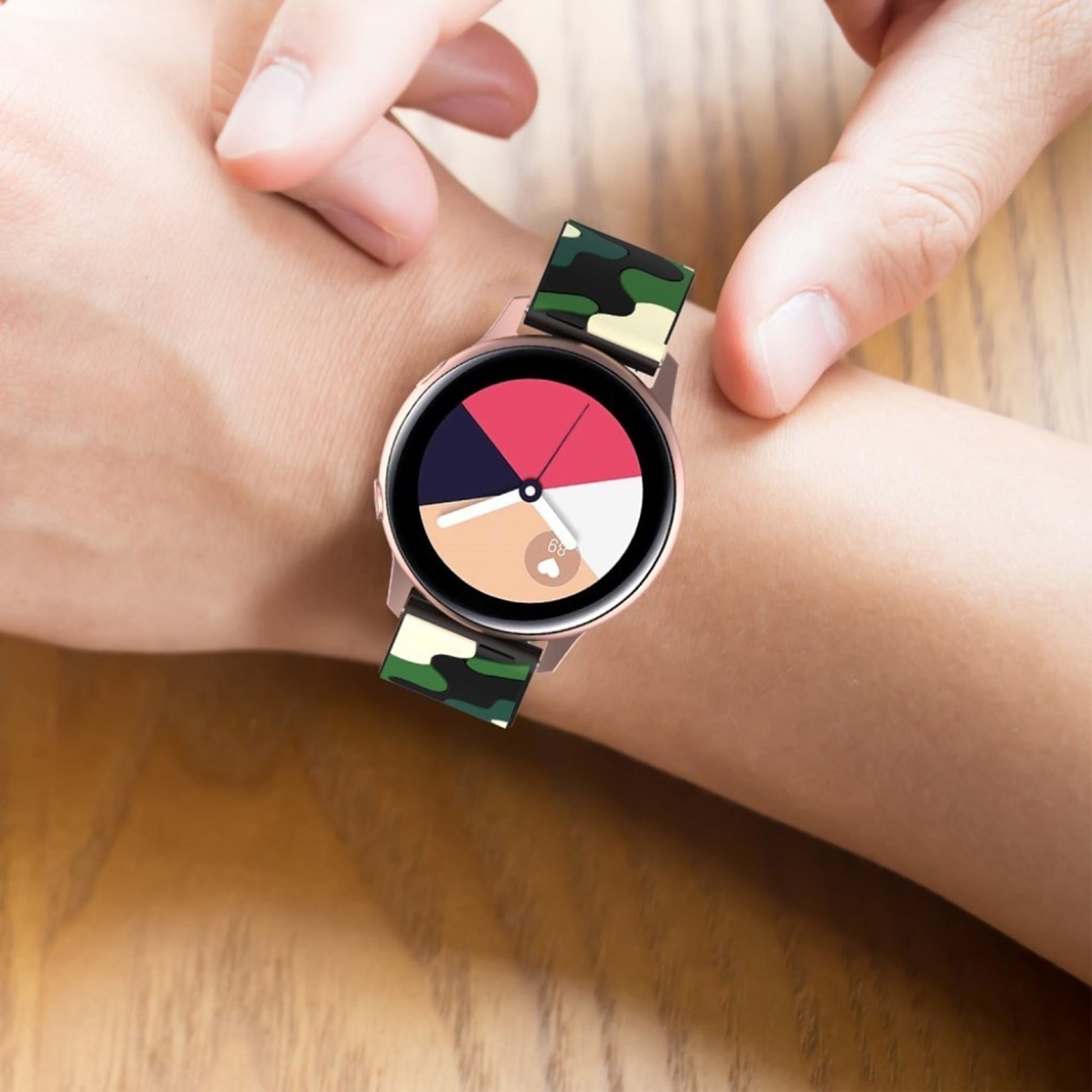 Scopri un bracciale in silicone ecologico dal design militare, perfetto per arricchire il tuo smartwatch. Realizzato con materiali di alta qualità, questo cinturino è progettato per adattarsi ai modelli Samsung Galaxy Active 2, Active R500, Watch 42mm e Gear S2 Classic. La sua particolare finitura in metallo placcato conferisce un tocco di eleganza, mentre il motivo camouflage offre un look distintivo e moderno, ideale per gli amanti dello stile avventuroso.Grazie alla sua struttura versatile, il cinturino presenta un design con molteplici fori, permettendo un'agevole regolazione della lunghezza per adattarsi comodamente a qualsiasi polso. Con una larghezza di 20 mm e una lunghezza totale di 125 + 84 mm, rappresenta la sostituzione perfetta per il tuo vecchio cinturino, aumentando la longevità e il comfort del tuo dispositivo. Aggiorna il tuo accessorio con un tocco di stile e funzionalità, senza compromettere l'ecosistema. Perfetto per ogni occasione, questo cinturino ti accompagnerà in ogni tua avventura quotidiana.