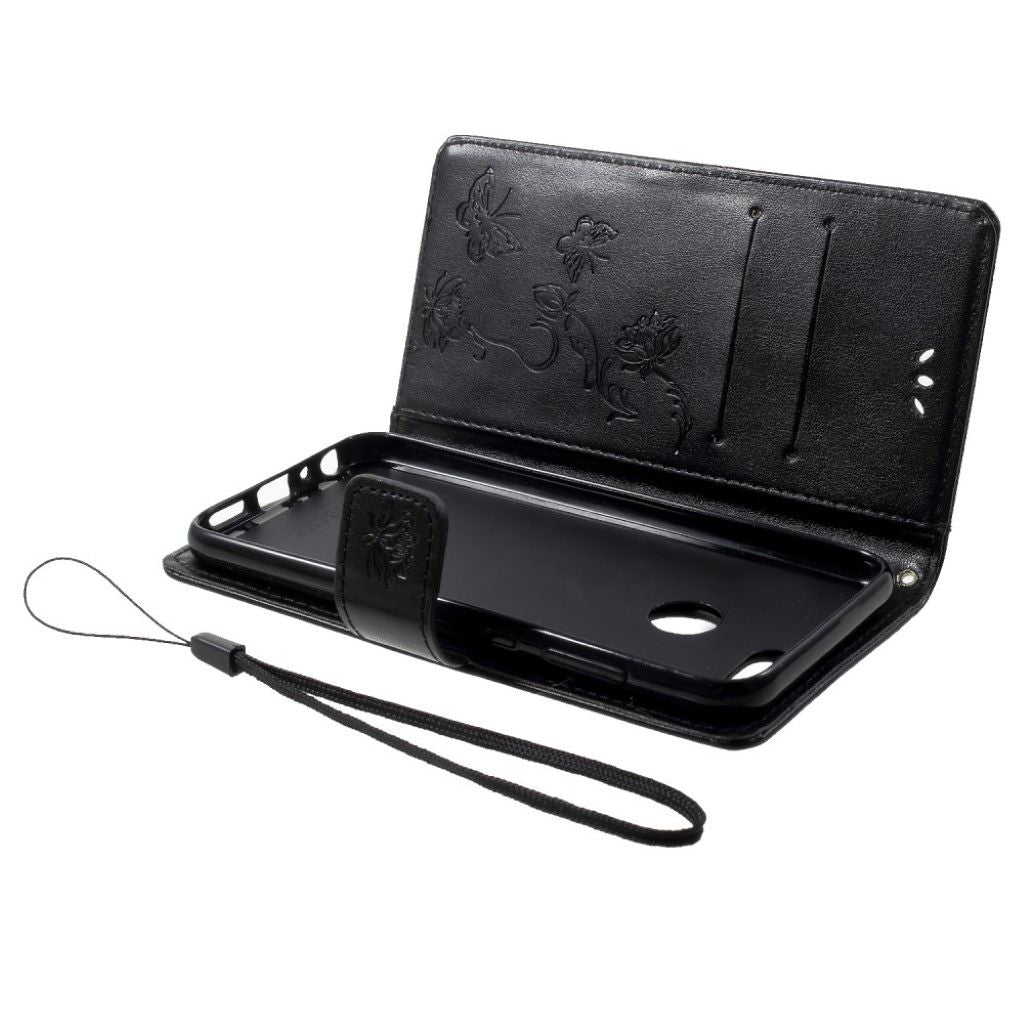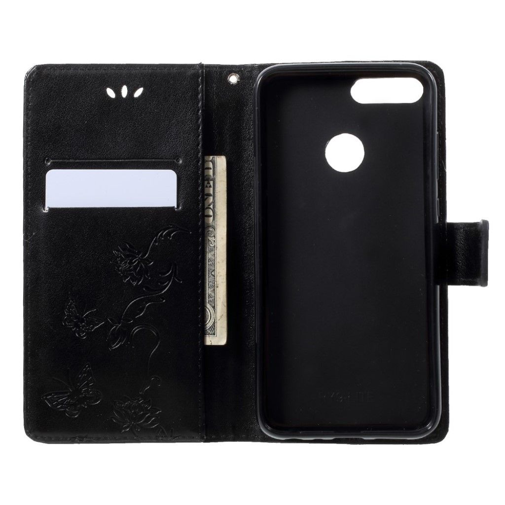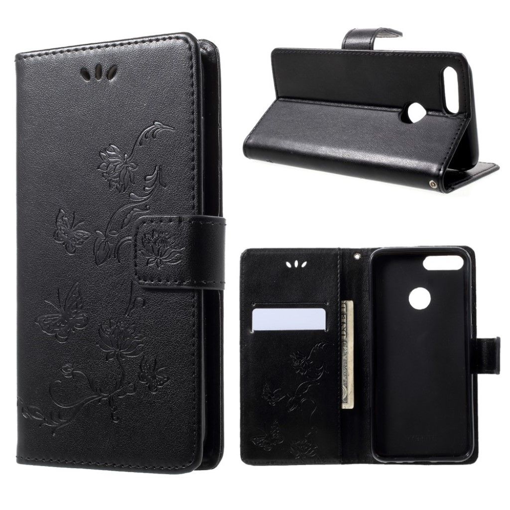 Custodia flip in pelle Huawei Honor 9 Lite con impronta di farfalla e fiore - Nero