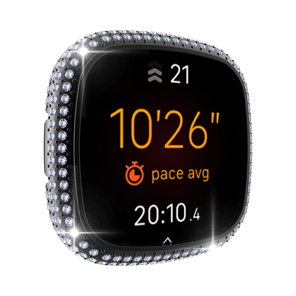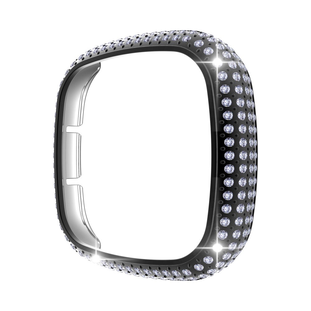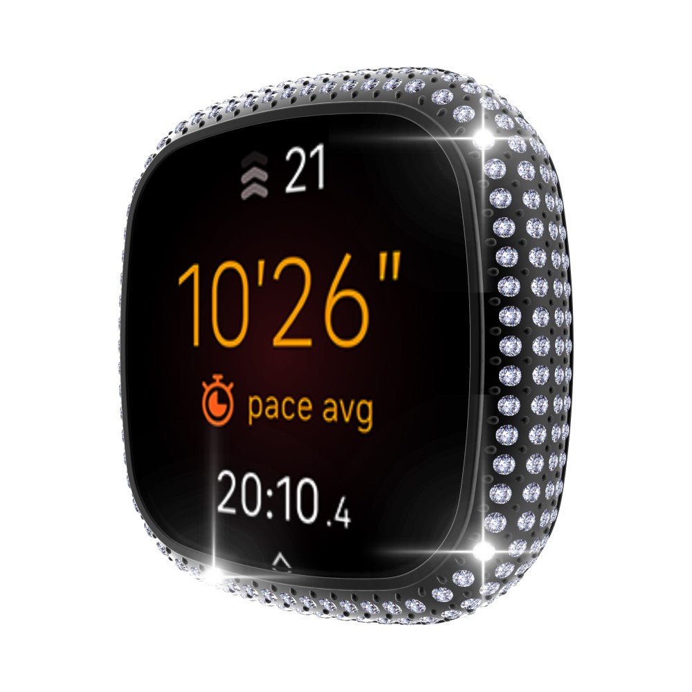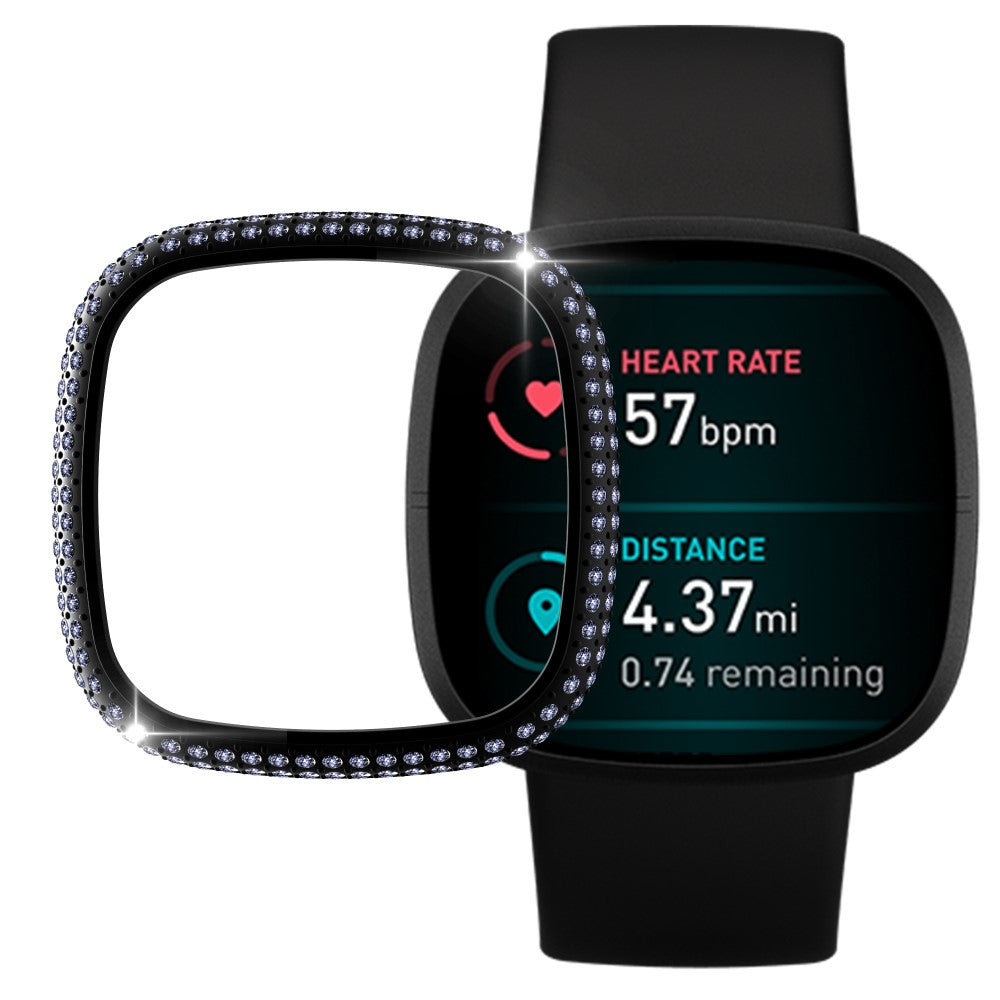 For Fitbit Versa 3/Sense Rhinestones Protective Watch Cover Anti-Scratch PC Half Bumper Cover - Black